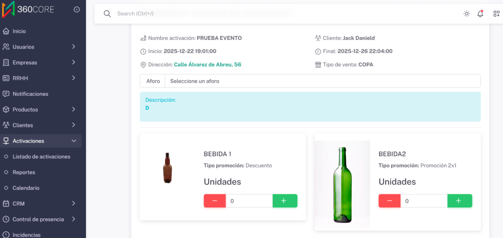 Gestión de eventos sin complicaciones. Planifica, organiza y controla tus eventos desde una única plataforma. GESTIÓN COMPLETA DEL EVENTO Todos los detalles necesarios en un solo lugar. Fecha, hora, dirección del cliente, productos y seguimiento venta. ASIGNACIÓN Y SEGUIMIENTO DE PROMOTORES Los promotores acceden a su trabajo desde cualquier dispositivo y registran resultados al instante. CONTROL DE DISTRIBUCIÓN DE PRODUCTOS Monitorea qué bebidas o productos se entregan, cuándo y a quién, de forma precisa y en tiempo real. VISION CLARA DE LA ACTIVIDAD Genera reportes claros y personalizados que muestran la efectividad de cada promoción o evento. Optimiza tus promociones Asegura que cada muestra llegue al lugar correcto y maximiza el impacto de tus campañas. Accesible y multiplataformaTus promotores pueden trabajar desde cualquier lugar, con móvil, tablet o PC. Ahorro de tiempo y erroresParametriza fácilmente tus eventos y genera informes automáticos, reduciendo tareas manuales. Pide tu cita y transforma tu distribución. Hablar con nosotros